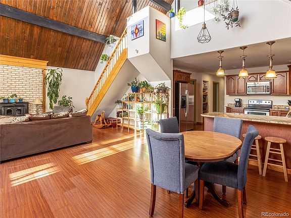 This 3-bedroom Chalet, at 2,200+ square feet, offers many options for living, entertaining, home office and/or hobbies or studio space. All in a great location! Tucked at the end of a cul de sac on a large, 3/4 acre lot, this home is located close to town by car and also by footpath. Enter from the deck to open living/dining/kitchen area with dramatic vaulted ceiling. This home is great for entertaining, and also has private spaces including large south-facing sunroom and a 270 sf shop/storage room with electricity and windows. The main bedroom is upstairs with its own 1/2 bath. Plenty of storage upstairs as well is accessed by panels in the closet and on the north wall. Also upstairs is an area overlooking the main level suitable as a media, play, or office space, and with beautiful valley and sunset views through west-facing windows. Downstairs are two additional bedrooms and a full bath. The spacious and well-conceived kitchen was remodeled in 2012 and features soft-close cabinetry, stainless appliances and solid surface Brazilian granite countertops. A door in the dining area accesses the south-facing sunroom, a cheery daytime space that also soaks in warmth on sunny Colorado winter days. The rear entry features a 8' x 9' mudroom with closet. The driveway has convenient parking for 4 vehicles. The back yard has a concrete patio, stone-bordered walkways, and a fenced dog run. Nicely protected with pinon pine in front and back. This is a great home with many possibilities.