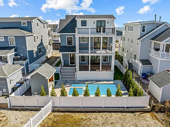 Experience some of Avalon’s finest water views in this brand-new, designer-furnished, custom home. Built by Vallese Developers and professionally furnished by Studio Blu Interiors, this home features 6 bedrooms, 7.5 bathrooms, plus an office, with water views of the inlet and back bays from nearly every room. The home’s exterior features woven hardy shake siding, a standing seam metal roof, Ipe decking, and mahogany ceilings with cap railings. Inside, the first floor welcomes you with 3 ensuite bedrooms, a fully equipped laundry room, a spacious family room with a custom-built wet bar, and a powder room that serves both the interior and the pool area. Engineered wide-plank flooring flows throughout, leading to a large, covered deck that overlooks the spacious backyard. The outdoor entertaining space has silver travertine surrounding a large pool, hot tub, and cabana. The perfect spot for relaxing after a day at the beach. The upper levels of the home are highlighted by ocean and inlet views from the family, dining, and kitchen areas. Vaulted ceilings with shiplap accents surround the family room, accented by a gas fireplace, while the chef’s kitchen includes quartz countertops and a high-end appliance suite. Sliding doors open to a spacious deck, ideal for relaxation and dining al fresco. A hallway bathroom and potential 7th bedroom, currently furnished as a private office, add flexibility to the home’s layout, with an additional bedroom and private deck offering views of the Townsends Inlet Bridge and the back bays. The third floor hosts the primary suite, offering yet more views and a luxury ensuite bathroom. An additional washer/dryer set and the 6th bedroom with ensuite bath complete this level, along with a 4-stop elevator connecting all floors. This turnkey property is ready for summer and is perfect for a buyer seeking expansive water views, custom finishes, and luxury living.