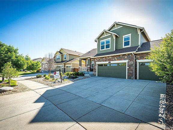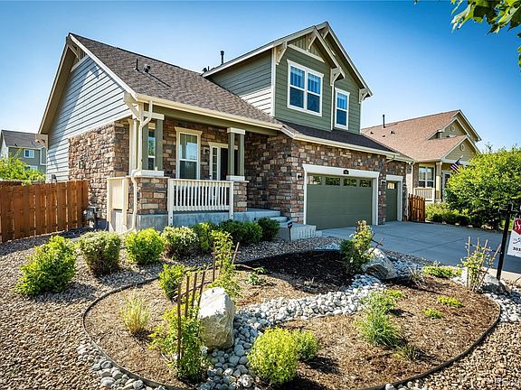 Showings start Friday on this one-owner immaculate 3 bedroom, 3 bath home in Adonea. From the moment you see the covered front porch, 3 car-garage and the easy-care xeriscaped front yard, this home will delight you. The bright and spacious vaulted family room with a ceiling fan and cozy corner fireplace is wired for surround sound! The family room flows into the dining room which leads to a sliding door overlooking your private fenced back yard oasis with huge, no-maintenance deck for year-round enjoyment. The large kitchen provides staggered oak cabinets with crown molding, and island with storage, newer appliances including 5 burner gas stove with double oven and Samsung dark granite fridge with flex drawer and convenient door-in-door storage. Take a moment to appreciate the fantastic natural light, pantry and ample cabinet and counter space! On the 2nd floor, escape to the spacious owner's room including walk-in closet and a luxurious attached bath with tile floors, super-shower with bench and dual sinks. The upper floor also boasts 2 additional large bedrooms, a full bath, and a convenient laundry room. The washer and dryer are included. This home gives you storage galore with a double closet near the garage entry, front hall closet, pantry and linen closet. There is also flexible additional space in the unfinished full basement which has rough-ins for plumbing and extra-tall ceilings - finishing the basement would provide additional fantastic living space! Tesla solar panels reduce your utility bills! Check out the 3-car garage with overhead storage! Stellar location with privacy and space between you and the neighbors. The yard even provides raised garden beds and a garden shed. Across the street from the Adonea Clubhouse, Pool and open space. This community has playgrounds, parks and trails, is just minutes from Buckley Space Force Base, convenient to DIA, 470 and I-70 and a quick drive to Denver or anywhere you want to be! Showings start Friday June 10th.
