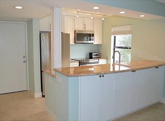 Beautifully upgraded third floor corner unit with gorgeous views of the lake and golf course. This much sought after 1 bedroom 1.5 bath condominium offers gorgeous sunset views from the 3 season room. Updated kitchen with granite & stainless steel and close proximity to heated pool. Everything you need for a terrific vacation in our little piece of paradise. Monthly rental rate does not include taxes, deposit or additional fees.