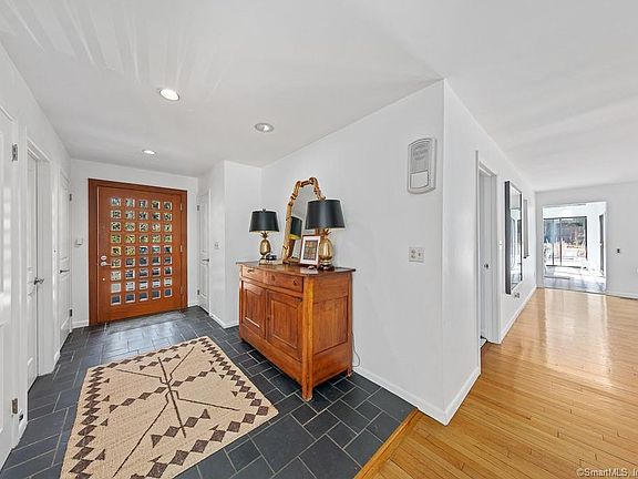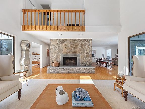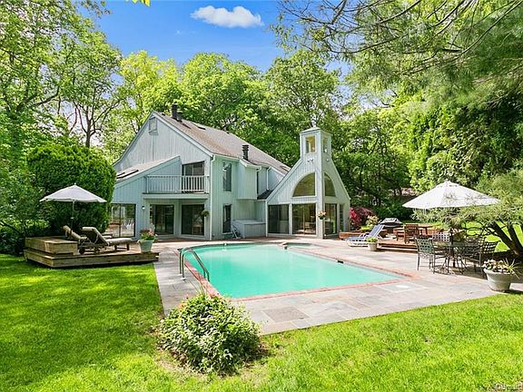 Chic 5-bedroom, 4-bathroom contemporary blends modern aesthetics with timeless design. Majestically set amidst a tranquil private tree lined property with gorgeous in-ground pool and expansive patio. The main level is spacious and open with seamlessly flowing interior and exterior spaces. Gather in the family room to enjoy a soaring ceiling, stone fireplace and sliders to the deck, or retreat to the unique built-in stadium style seating in the living room. The chefs kitchen captures form and function with stainless steel appliances, a light-filled seating area, pantry, and easy patio access for cooking outdoors year-round. The primary bedroom on the upper level features a fireplace, walk-in closet, and spacious spa bathroom with two vanities. Additionally, one ensuite bedroom and three bedrooms share the hallway full bath. Laundry and walk-in storage closet complete this level. The third-floor loft offers flexible living or storage space, tucked away yet easily accessible. The mudroom oversized 3 car garage, and full basement offer plenty of space to store seasonal supplies. The outdoor space features an in-ground pool, wrap around patio and deck, lush lawn, mature landscaping, and a driveway with space for parking and play. The central location of this property makes it minutes from schools, town amenities, and commuter routes. Offers due Monday, May 2 at 12:00pm.