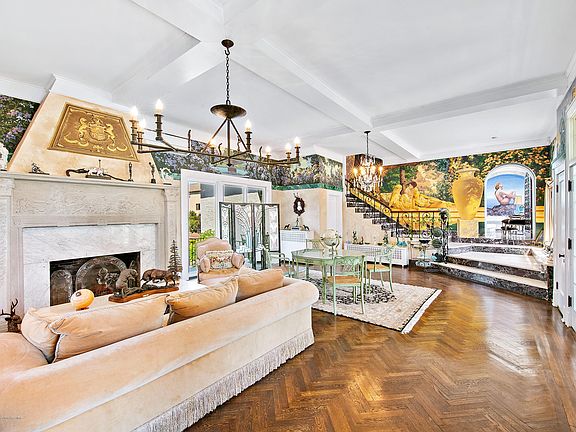 - RoomLivingRoomFeatures: Dec Molding, Floor - Wood, Fireplace - Woodburning, Ceilings - Beamed