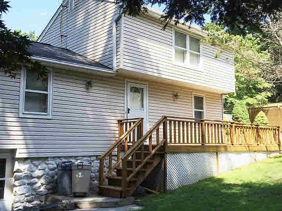 This charming starter home boasts a cozy carpeted LR with cathedral ceilings and a wood burning stove. The kitchen and dining room have an open plan affording hardwood floors throughout and open to the back deck through sliding glass doors. Walking out to the deck you will be immediately embraced by the peacefulness of this fenced in, very private oasis. The stonework and landscaping have been meticulously maintained. Upstairs houses two newly carpeted bedrooms - One of them being the master bedroom suite with a walk in closet. A REAL MUST SEE!