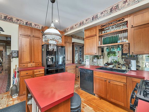 A true historic property in Alton! Built in 1880 the pride of ownership is very apparent as the current owners have meticulously maintained this gem. The wrap around porch is excellent for those relaxing summer days and you also have a covered back porch right off the kitchen. Inside the floor plan works great for entertaining as the kitchen is open to the dining room, a walk in pantry, the front room, as well as a three season enclosed porch. The main level also includes a large living room, bedroom and full bathroom. Upstairs we have the primary bedroom with a walk in closet. This space leads to a third floor office space and extra bonus room. Down the hall we have three more bedrooms, a full bathroom, the laundry room as well as a nice sitting area. The real surprise is the fully loaded family room on the second floor of the barn! The custom penny bar is a real conversation piece. Plenty of room for both watching games on the big screen tv or for indoor games as well. The current owners had the original copula on top of the barn fully restored to its original glory. Come and see what this property has to offer! Open House 8/12 from 10-12.