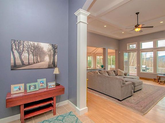 Tucked into the hillside of Hales Location, enjoy tranquility and sweeping mountain views from this stunning 5 acre property just a short drive from North Conway Village. Abutting the National Forest, this traditional and elegant home features an open floor plan, stone fireplace, walls of glass showcasing the mountains, a tastefully appointed kitchen, hardwood floors, high ceilings, a welcoming mudroom, and first floor master suite. The formal dining room plus eat-in kitchen with island offers flexible options for entertaining. The walk-out lower level has two comfortable bedrooms with en suite baths and a recreation room with a cozy pellet stove. The above garage bonus room with separate staircase makes the perfect spot for crafts, a private guest room or working when you arenât outside playing. An artfully landscaped yard plus a sky-high deck serving up fresh air and broad views of the Cranmore slopes, low taxes and Hales Location golf memberships for four complete this perfect package.