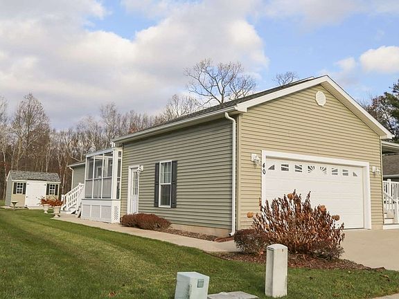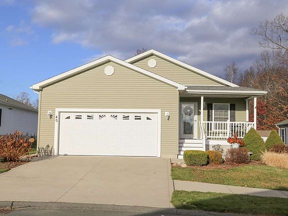 Beautiful Liberty Manor, Westfield MA 55+ community. This home is immaculate & bright with open floor plan. There is a covered front porch, spacious living room, eat in kitchen-dining area with large island & new countertops. Sliding doors lead to a screened Trex deck and attached cement patio, perfect for grilling. The lovely master suite has large walk in closet and scenic views of the lawn & quiet wooded area. The master bath boasts a double vanity and walk in shower with glass door. The second bedroom is bright and spacious with another large walk-in closet. There is a second full bath with shower-tub combination and a separate laundry room with deep-set sink, cabinet, and shelving. The 3rd bedroom located off the living room with French-doors & closet could be a well appointed office or den. There is a two-car attached garage with pulldown stares to attic storage. This property comes with central air, concrete driveway, landscaped front yard, storage shed and inground sprinklers.