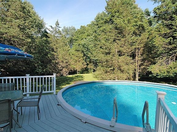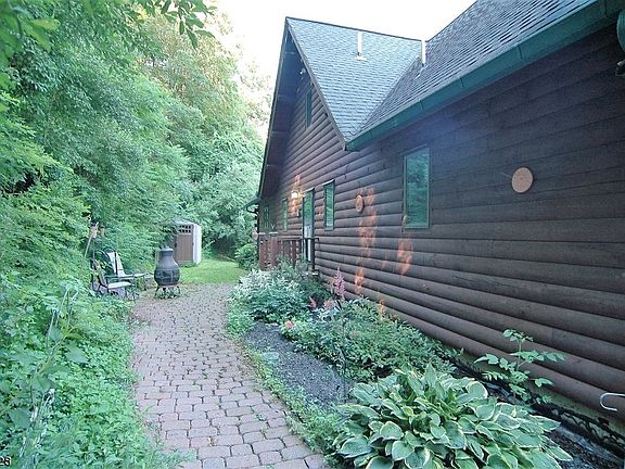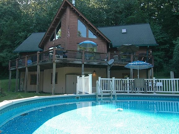 Come see this outstanding custom Beaver Mtn Log Home with open floor plan located on a quiet country rd which runs along the Paulinskill River and close to some of the best hiking you'll ever find. Convenient to major hwys, great local restaurants & shopping, let this hillside setting take you away as you enjoy the views from you're large deck overlooking the pool. Quality 50 yr roof at time of construction. Inside are many custom features...eastern white pine walls, granite counters in kitchen, 18' ceilings, custom stone FP which is the focal point of the LR. Master Bedroom & bath on 1st floor, 2nd & 3rd BR &full bath on 2nd floor with loft. Finished walkout basement offers the 4th BR & full bath. Rec/family room incl, dry bar and pellet stove, also a bonus room for office/workshop and storage room.