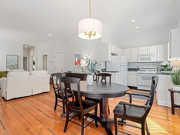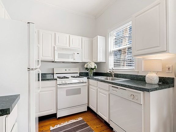 Rare, sun splashed two bedroom floor through in prime location with all the key features you have on your list! Open plan kitchen, living and dining with soaring ceilings and wood burning fireplace. Kitchen with ample space for entertaining and gas cooking. Bay window, high ceilings, original pine boards, custom built-in and lovely, private deck complete the living space. Primary bedroom suitable for King or Queen and additional furnishings, two closets and adjacent to over-sized tiled bath with tub/shower and vanity storage. Spacious second bedroom perfect for guests/office. All this and in unit washer/dryer, A/C, additional basement storage and 100% owner occupied association.