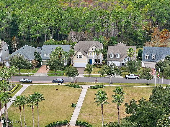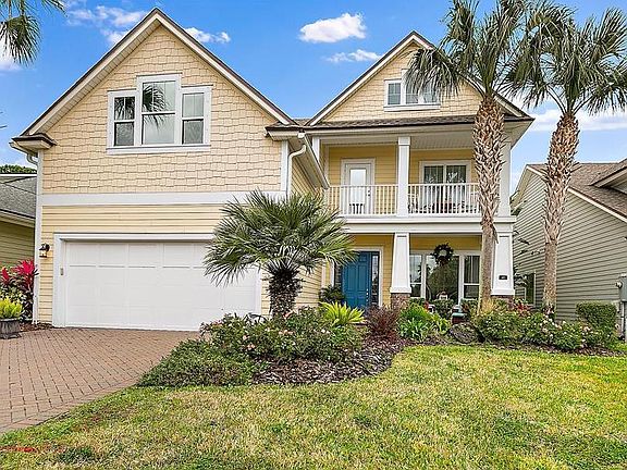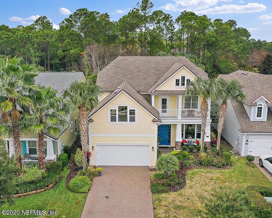 Beautiful Key West style family home overlooking preserve w/ waterview in highly desirable Coastal Oaks in Nocatee. This Stonebrook plan has much to boast about; shiplap accent wall in family room with main wood floor throughout main living area. Built in seating in breakfast area with open concept living. Charming half bath plus office/bedroom with closet on the main level. Covered patio overlooking large backyard with plenty of room for a pool to be designed. Paver driveway for 4 cars plus 2 car garage with great storage. Large Owner's retreat upstairs with closet system & two additional bedrooms plus a large bonus room which could be used as an additional bedroom/flexroom. Front upstairs balcony overlooks Residents' Clubhouse & pools. Close to Town Center and Nocatee amenities.