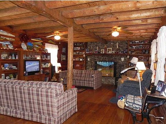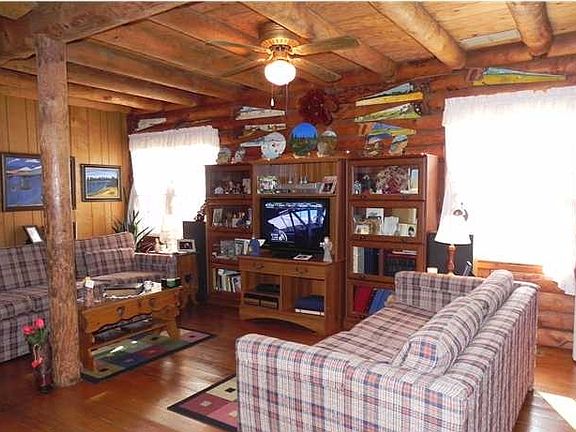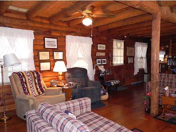 True log cabin..situated on 2 acres . Has den with fireplace and family room with woodburning heater. 3 bedrooms and 2.5 baths.country kitchen..circle driveway. side porch and front porch. metal roof..must see