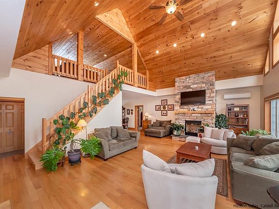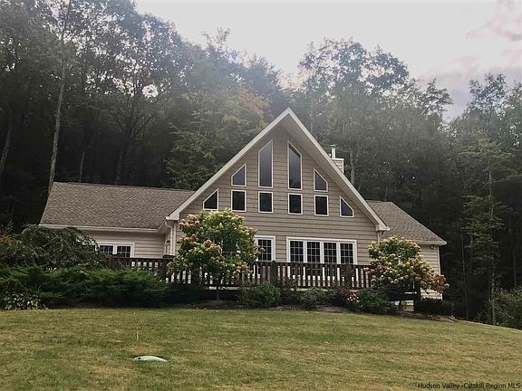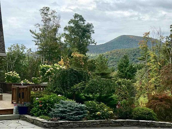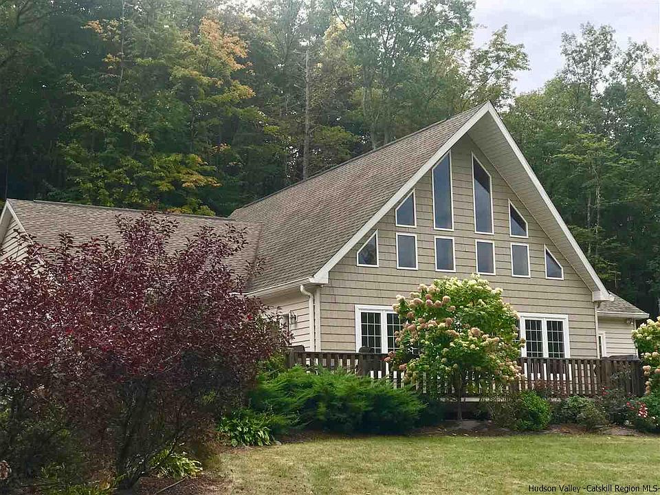 Oh what a view! This well maintained contemporary home has a wall of glass looking out on the most gorgeous Catskill Mountain view and a stone fireplace for cozying up on those cold winter nights. Privately sited on 6 acres that abuts up to NYC DEP land. Just minutes to Woodstock and Phoenicia. Belleayre/Hunter Mountains for skiing is just a short drive away. Warm and cozy with stone fireplace, cathedral ceilings, 3 bedrooms and 2 baths on the main floor with a large open sleep loft (with extra storage areas). Gourmet kitchen with wonderful cookstove, granite countertops, nicely appointed cabinetry, walk in pantry and breakfast stools for countertop snacking. Dining area is right off of the kitchen and is perfect for entertaining. Large full basement with workroom and wood stove. Ready to be finished for extra space. Backup Briggs & Stratton Generator for when the power goes out. Nothing to do but move in and enjoy the simple country life with hiking, biking, fishing, tubing, swimming and skiing all within a short distance of this beautiful home.