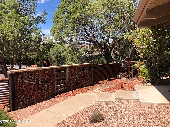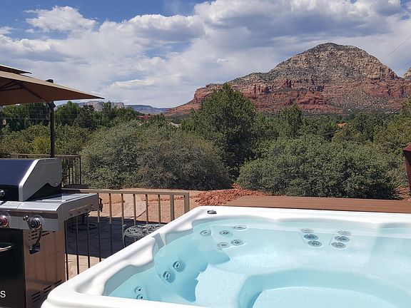 VIEWS! VIEWS! VIEWS! POSSIBLE OWNER FINANCING (Owner may carry with 30% Down at 6.5% for 15 years). Expansive windows showcase Sedona's stunning red rocks from almost every room in this single level, split bedroom upgraded home. Nestled on a spacious .48 acre lot surrounded by natural vegetation, this private oasis boasts a spacious outdoor entertaining area with an elevated Trex deck running the length of home. A custom fire pit area and 6-person hot tub complete the backyard paradise. The massive great room has floor to ceiling windows with an exquisite vaulted wood ceiling, connecting to a large dining area, kitchen with granite countertops and a large walk-in pantry. The roomy main suite is light and bright with a large window and full sliding glass door to the deck and hot tub. The main bathroom has dual granite vanities and large linen cabinet, opposite the sizable walk-in closet. The ample 2nd bedroom also has a sliding glass door opening to the back deck and a walk-in closet. The 3rd bedroom has a walk-in closet as well. All bedrooms have been recently upgraded with new carpeting and ceiling fans. The 2nd bathroom also has a granite countertop, newer fixtures and a massive linen closet. The home has been augmented with many custom metal, iron and rock artistic walls, benches and rails to fuse with the surrounding beauty of the area. The garage includes built-in cabinetry, work areas and a utility sink for all of your projects as well as a separate lockout storage area. This property can be an excellent investment property; it is licensed and operates as a successful VRBO short term rental with stellar reviews (See VRBO listing #1102893). Most furnishings can be negotiated as part of the sale if the buyer desires to continue the VRBO rental business or to have a turnkey 2nd home. Either way, this ideally located property in West Sedona must be seen to truly appreciate all of the amenities and views this home offers!