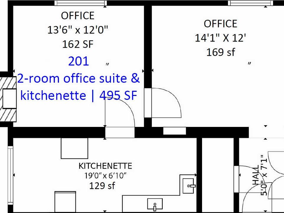 Suite 201 is 2-office plus kitchenette offering of 495 +/- total SF. Beautiful oversized windows look out onto Pleasant St and State St. Historic 1860's Customs House situated in the heart of Portsmouth at the intersection of Pleasant and State St. The 2nd floor has a wide spacious hallway and tall ceilings. A stately stairway to the 3rd floor is in view at the end of the hall. This wonderful building has central AC, passenger elevator access, and parking spots available with the option to rent additional spots. Free parking for up to 72 hours is just a few blocks away in the municipal lot at Pleasant and Richmond. Come look and see to see if this space in this wonderful historic building in a great, central location could be tailored to your needs! There are additional offices and space available affording some flexibility in lease dimensions. See additional listings for additional available offices - MLS#4754743, #203 - single office +/- 351 SF and MLS#4792841, #205 - a single office +/- 266 SF with large utility closed.