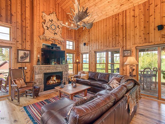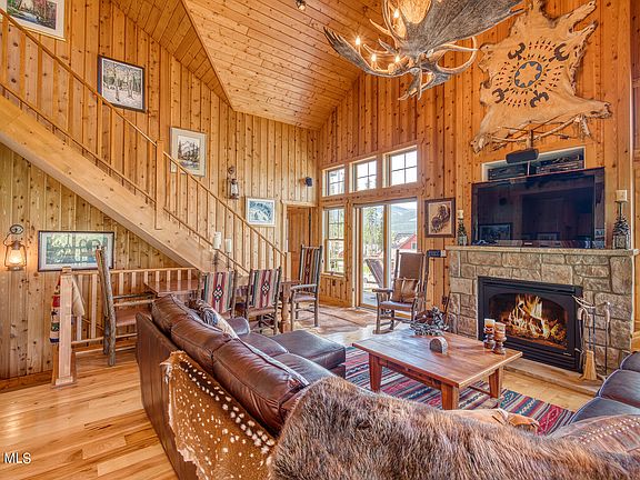 Quiet location at the end of dead-end street surrounded by open space with trail access out the front door-this quintessential mountain cabin has it all! From the soaring vaulted ceilings, beautiful wood panel interiors, wood flooring, moose chandelier, beautiful gas fireplace, enlarged wrap around decks with deck heaters and deck shades providing a usable exterior space for 3 seasons- you will never want to leave! Lower-level primary suite has a beautiful temperature-controlled rock gas fire place, main level master has large walk-in closet with 5 piece bath including jetted tub, upper guest bedroom has bath with extra storage and small office area. This home has lots of storage and has central air conditioning. It is the perfect rustic cabin with all the modern convenience!