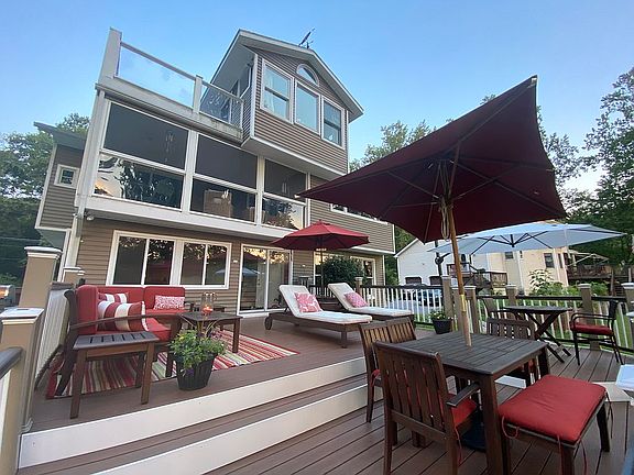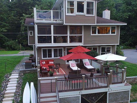 Riverfront Getaway: This amazing riverfront properly is minutes away from the Pocono Mountains, one hour away from New York City, and 1.5 hours away from Philadelphia and the Jersey Shore. This lovely updated home on the Delaware river is a double master, with 2 bedrooms, 2.5 bathrooms and is close to outlet shopping, ski resorts, and NYC. Go for a hike at nearby Appalachian Trail, the Delaware Water Gap, or just kayak, canoe or fish from your own back yard. The house was completely renovated in 2007. More recent updates include a large deck, updated heating & cooling systems, new propane tanks, , new large storage shed/ child playhouse, and a paved driveway. Parking includes room for 7+ cars. On the lower floor enjoy a family/recreation room, with a new wood burning stove, a sunroom, and a 2-car garage. Outside, there is a large deck with plenty of room for family and friends. Under deck storage has racks for kayaks and canoes. A new shed can serve as a playhouse, yoga studio, or storage. Twenty five feet of private Delaware river frontage is just a few steps away. A new large fire pit awaits you at the river bank. On the main floor you will find a semi-open concept with all views leading to the river. The kitchen is updated with modern appliances and a beautiful view. A cozy enclosed three-season porch is available just off the kitchen. The living room, large dining room, laundry room, utility room, and powder room are all on the main floor, as well as one of the two master bedrooms with an en suite bathroom with tub and a walk in closet. Enjoy your favorite beverages from the wet bar area equipped with a kegerator beer dispenser. There is also access to the attic’s generous storage area from this level. The top floor boasts the ultimate master bedroom, with an en suite bathroom with dual sinks and large tile shower, walk in closet,and private deck with a gorgeous river view. This home is in a very safe area and has a remote country feel, yet is close to everything you could possibly need.