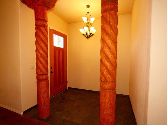 Pride in craftsmanship shows in this beautiful southwestern home with an indoor/outdoor fireplace, covered patio, pond and waterfall. As you enter enjoy the solid wood pillars, latillas & vigas, hand troweled textured walls, and the hand-scraped prefinished Tuna hardwood floors. In the kitchen enjoy the stainless steel appliances, including a refrigerator/freezer combo, granite counter tops, two-toned knotty alder cabinets, slate floor and large pantry. Relax in the large living room and large bedrooms. Master and 2nd bedrooms have access to the solid wood covered patio. Park your big vehicles and still have room to work in the oversized two-car garage.