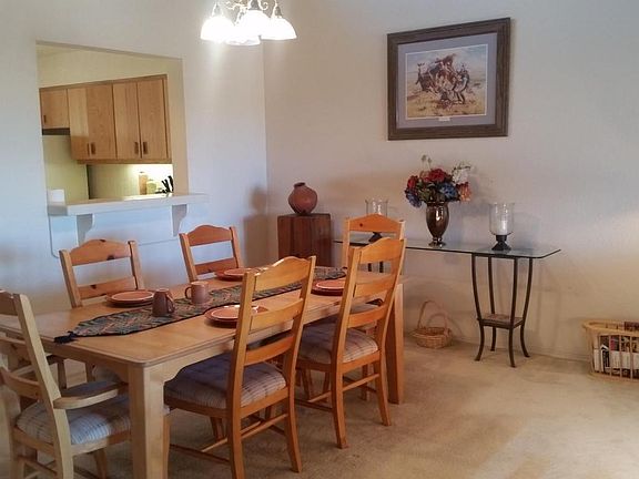 TURNKEY investment. Fully furnished 2 bed 2 bath townhouse with red rock views. Peaceful setting, backs to an open ranch field. Ideal for vacation rental OR full time residency. A wood burning fireplace in living room with cathedral, wooden planks ceiling. Monthly HOA dues of $380.00, among so many other benefits, includes unlimited golfing for a homeowner. Friendly community of Canyon Mesa Country Club offers care-free living at its best. View it now and you be the judge!