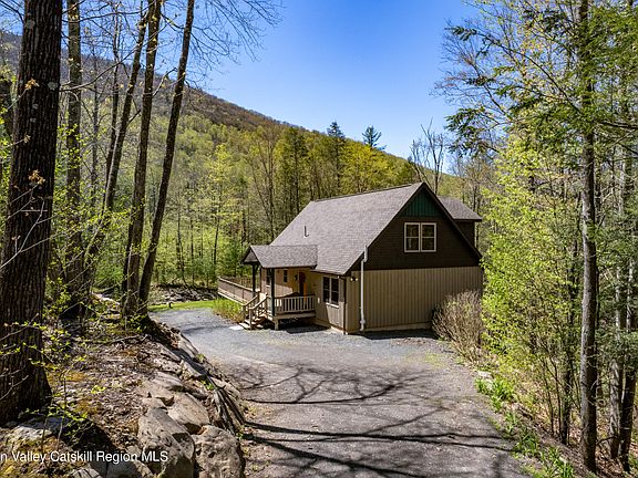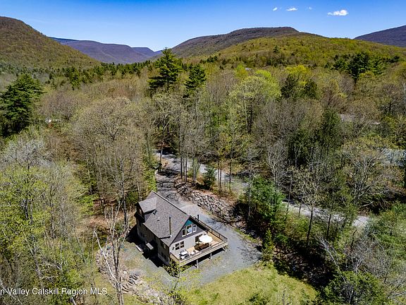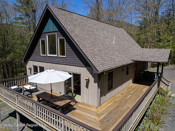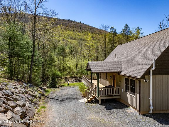 For those seeking a newer home but without the wait comes the beautiful Silverwood, a stunning contemporary country home with arts and crafts influences, that is only eight years young. This ample, highly efficient and smart home has an open floor plan with wonderfully high ceilings, flooded with natural light, and has windows galore through which to enjoy the breathtaking Catskills vistas. The main level consists of two bedrooms, a full bathroom, and an airy open concept floor plan with a massive eat in gourmet chef's kitchen and a great room style living room, off of which you will find a generous wrap around deck with sensational views and plenty of room to enjoy al fresco dining and relaxing. Upstairs you will find the jumbo primary bedroom along with another full bathroom and a large balcony area for a home office or any other number of other uses. Heading into the full walk-out basement, you will find surprise after surprise including another bedroom, half bath, a giant living area, a rock climbing wall, and tons of storage space. With its own separate entrance and a driveway leading up to it, the downstairs space has limitless potential. Outside you will find a quiet and pretty yard with its graceful levels of meadow that back the forest, well-landscaped with gorgeous maples, oaks, sycamores, beeches and more, helping to create a lovely canopy against the mountain views you will enjoy in all four seasons. There is plenty of room for a garden, hot tub, swing set, and more. Chichester is a much loved hamlet that is well positioned in the heart of the Catskill Park, just three miles from everyone's favorite small town of Phoenicia with its vibrant and charming small town flavor and iconic Diner, and just eleven miles from Hunter Mountain. The position on a town maintained road feels private but not overly secluded, and with NYC-owned Forever Wild land backing the property, privacy for years to come is ensured. The close-by Stony Clove Creek provides fishing and swimming opportunities and a glorious soundtrack. The house has had an illustrious track record as both a vacation rental and a beloved gathering place of loved ones. With no shortage of spots for home office space, plus excellent high speed cable internet readily available, and bus service to NYC close by, Silverwood's work-from-home potential is fierce. For those looking for something very turn key, the furniture, purchased only three years ago, is available.