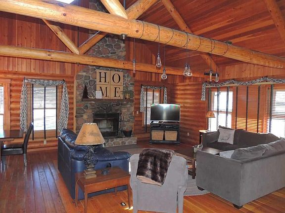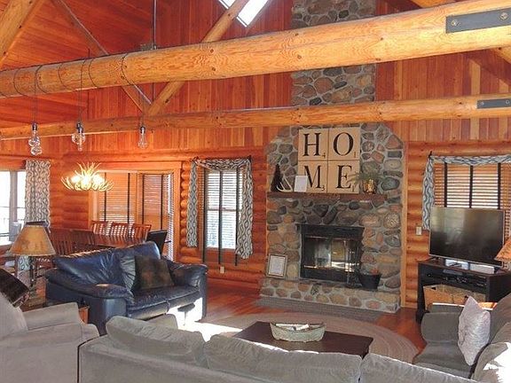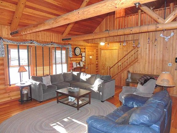 Enjoy the warmth and coziness of this custom-crafted log home offering a beautifully treed backdrop and currently licensed for rental! Main level features great room with exposed log beams and dramatic floor to ceiling wood-burning fireplace, large kitchen with breakfast bar and separate dining area, spacious master bedroom, additional guest bedroom, and full bath with updated vanity. Upper level houses open loft suite bedroom that overlooks the great room and has its own sitting area and private bath with double vanity. Expansive walk-out lower level with generous family room/recreation room and pool table, two guest bedrooms and full bath, and laundry room with deep basin sink. Additional amenities include expansive covered front porch, rear 3 seasons room, and private hot tub area to rear. Licensed for rental and currently enrolled with Rosebud Rentals rental agency. Great opportunity to own a turn-key 5 bedroom rental home and vacation home, or enjoy rustic log home living full time. Sold fully furnished with contents to be negotiated and transferred via separate bill of sale.