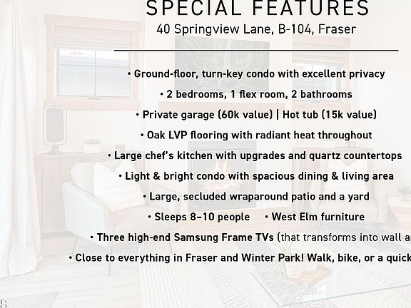 Fully Furnished Ground-Floor Condo with Private Hot Tub, Garage, and Stunning Mountain Views! Step into this immaculate 2-bedroom, 1-flex room, 2-bathroom condo in the sought-after Elk Creek community. This modern mountain retreat offers the best of Fraser and Winter Park, all within walking distance. Park your car in the private garage, valued at $60k, and enjoy the convenience of being close to everything. The chef's kitchen with quartz countertops and several upgrades leads into a spacious dining area that comfortably seats 10. The bright and airy living room is perfect for relaxing after a day on the slope. High-end finishes include 10' ceilings, upgraded luxury vinyl plank flooring with radiant heat, three Samsung Frame TVs that transform into wall art, and tasteful West Elm furnishings throughout. Outside, a large wraparound patio offers privacy and tranquility, featuring a hot tub and a yard area perfect for pets and children. You also have a private ski locker. The condo sleeps 8-10 people, making it an ideal choice for short-term rentals, though it has never been rented by the current owner and remains in pristine condition. Enjoy breathtaking mountain views, including Byers Peak, from your secluded mountain home. Just minutes from the Grand Park Rec Center, local breweries, restaurants, and the free shuttle stop, you'll have easy access to trails and be only 7 minutes from Winter Park Ski Resort. Don't miss this turn-key opportunity to own a luxurious condo that perfectly balances convenience, comfort, and outdoor adventure!