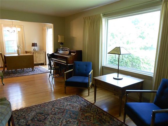 For sale by owner. OPEN HOUSE 2/24/18, 11:00 - 12:30. This charming house has been lovingly cared for since 1955. The first floor has a large living room, with a huge wood-burning fireplace, dining room, eat-in kitchen and first floor bedroom or den plus a full bath. The second floor has three bedrooms and another full bath. Beautiful hardwood floors throughout. Half the basement is finished with wood paneled walls and can be used as a rec room. The other half of the basement has the laundry and storage areas, including a cedar paneled clothes closet. There's a nice breezeway porch between the house and the garage and a lovely back yard patio, a huge backyard with a large 3 section garden shed. Central heating and air conditioning. It's a wonderful street close to the new library, town hall and I Square. 15 - 20 minutes from downtown Rochester, UofR, and RIT. Ideal for a young family