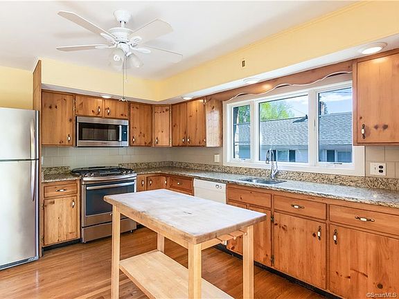 Expanded and renovated and only one block to the Historic Guilford Green. This 1948 stone Cape Cod style home has a lovely Living Room with a stone fireplace, a large, open floor plan Kitchen that is open to the Dining Room, and a first-floor Bedroom that is currently opened up to be a Den. There is a renovated first-floor Bathroom with a stylish shower stall with a smooth river rock floor. Upstairs there is a Master Bedroom with 2 closets, 1 a large, walk-in. The 2nd Bedroom has access to the laundry room. Off the hall and the master bedroom is a beautiful full Bath with a custom shower with a bench and a sink integrated into a furniture piece. A bonus feature is a private deck off the master bedroom - perfect for morning coffee. The current owners installed a Connecticut Basement System in the basement and there has not been any water in the basement since that work was done. The Finished space in the basement consists of two rooms, one with a wood-burning fireplace This is excellent extra space in this house. The level .18 acres lot is fenced on the perimeter and, in addition to the new deck off the mudroom and dining room, there is platform with a covered canvas cabana. Additionally, there is a Koi pond and a detached two-car garage. An easy stroll to the town free library, activities on the Green, the shops and restaurants that surround the Green and this home is located just a few blocks to the larger stores on Route One. Residing here affords the best of in-town living.