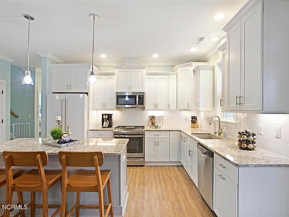 VA assumable rate at 2.875%! Positioned on a peaceful cul-de-sac lot, this meticulously maintained residence boasts four bedrooms and three baths, offering a turnkey living experience. As you step through the door, you are greeted by an inviting open-concept living room, kitchen, and dining area. The dining room showcases coffered ceilings, adding a touch of elegance, while the living room emanates warmth with a cozy gas fireplace. The white kitchen is a chef's dream, featuring a 6ft island, upgraded appliances, reverse osmosis water system and luxurious granite counters. The floor-plan is a dream boasting 2 bedrooms and the master suite on primary level and 1 bedroom, full bathroom and huge bonus room on the 2nd level. When you enter the walk in attic you will be delighted to see a 2 person infrared, like new, sauna. The master suite is like your own private oasis, adorned with tray ceilings and his-and-hers walk-in closets. The master bath is equally impressive, offering dual vanities a walk-in, tiled shower for a spa-like experience and a huge and luxurious soaking tub. Practicality meets style in the laundry room, which offers abundant space for front-loading appliances and includes a convenient mud sink. Outside you will appreciate the whole house electrical modification for generator power, your large backyard and all that Crown Pointe has to offer with its charming sidewalks, street lights, a community pool and day dock. Indulge in the epitome of gracious living in this Hampstead gem, where every detail has been carefully considered to offer a lifestyle of comfort and luxury. Call for your private tour today!