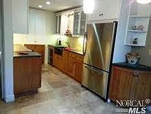 At last a 2 bed/2 full bath, ground floor condo at the Meadows w/an extra large, sunny patio exquisitely remodeled kitchen featuring expansion w/soap stone slab counters, custom maple cabinets, stainless appliances, travertine brick backsplash, recessed lighting builtin breakfast counter. Travertine...