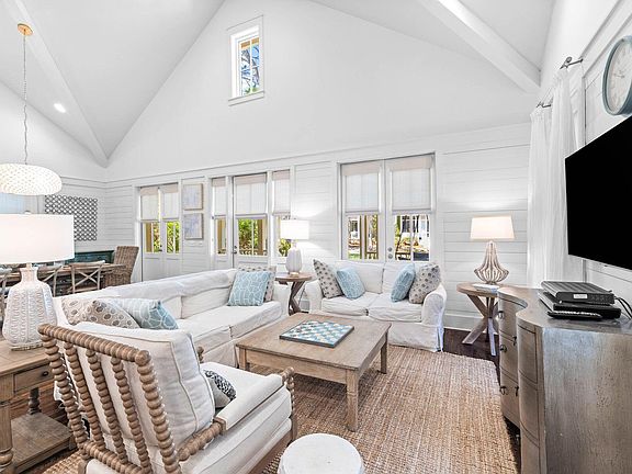 Discover the allure of this delightful Florida cottage with carriage house nestled naturally in tree-lined surroundings. To the front, this charming home has a large front porch overlooking a green pocket park. To the rear, a paved driveway provides access to a detached carriage house above the two-car garage. Step inside to find a light and open great room with soaring ceilings and multiple windows enhancing this well-planned space. Hardwood flooring flows through the sitting room and kitchen into the dining room, easily seating eight people for dinner. The kitchen is well-appointed with crisp white cabinets, veined granite countertops and glass wall tiles. Wolf and Sub-Zero stainless appliances and a twin butler's sink make this an area of culinary creativity. The first-floor master includes a generously sized bathroom with a twin vanity and a large walk-in shower. Stairs lead up to a loft/sitting area with custom built in bunk beds and additional guest bedroom and bath. Independent family members and guests can enjoy their own privacy in the well-appointed carriage house. As well as a bedroom and bathroom, it has a fully equipped kitchenette with everything you need to prepare breakfast, drinks and snacks. Outdoor living can be enjoyed on the screened back porch, leading to a deck perfect for barbecuing and alfresco dining. It complements the large front porch where you can enjoy your morning coffee in a very peaceful setting. WaterColor amenities are hard to beat, with nine community pools, pocket parks, shops, restaurants, walking/biking trails, and tennis and pickleball courts. Kids will love the lazy river and water-based fun at Camp WaterColor. There's even a fully stocked boathouse on the 220-acre Western Lake. Try your hand at kayaking and paddleboarding surrounded by nature on this remarkable coastal dune lake. The nearby beach offers sunning, swimming, and sunset strolls, or you can use the excellent facilities at the private beach club. It's all part of the idyllic WaterColor lifestyle.