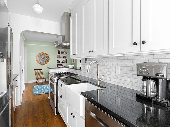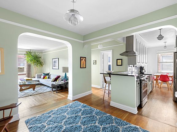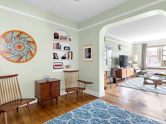 Located on the top floor of a pre-war elevator coop, this beautifully renovated and abundantly sunny 1BD home has an expansive layout and is completely move-in ready! The light-filled apartment has been thoughtfully and stylishly customized throughout while incorporating lovely original architectural details, including classic Art Deco archways; built-in storage nooks; hardwood floors; and ceiling, floor and picture molding. It features a large entry foyer that is an ideal home office. A stunning open eat-in kitchen highlights the space. It shines with white cabinetry with under-cabinet lighting; marble tile backsplash; abundant storage and granite countertop prep space; stainless appliances (including dishwasher); convenient breakfast bar; and windowed dining area. The living room is similarly airy and spacious while the over-sized bedroom features double exposures. The windowed bathroom has also been fully renovated with a jacuzzi tub and classic finishes. Notably, a deeded basement storage space is included. Additional features include new plumbing; high ceilings; huge closets outfitted by California Closets to maximize storage space; schoolhouse and mid-century style lighting fixtures; and darkening shades in the bedroom. The pet-friendly building has a live-in super; central laundry; bike and storage rooms; and common rear yard with a community grill and picnic tables. Conveniently located on a tree-lined street, it is only 1 block to the F/G train and nearby to Prospect Park as well as neighborhood favorites Hamilton's Restaurant, Brancaccio's Food Shop, Jaya Yoga, and Steeplechase Coffee. Please note that the current maintenance listed above includes an ongoing assessment of $113/mo.