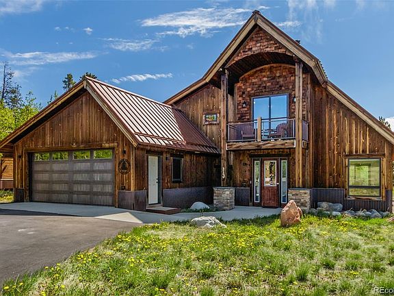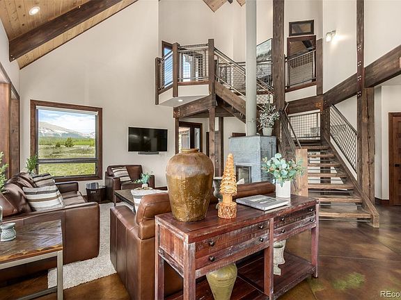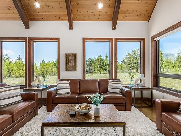 Your dream mountain retreat awaits on 3 private acres of pristine wilderness! Set amidst a picturesque landscape, the fully-fenced and gated property is graced with abundant pine and aspen trees, along with breathtaking mountain views. Beautifully designed from top to bottom, the home enchants with soaring vaulted tongue and groove ceilings with exposed beams, brilliant natural light, custom window treatments, quartz countertops & fresh neutral paint. Polished concrete floors run throughout the expansive open concept main floor that is anchored by a free-standing soapstone masonry wood-burning fireplace. The main floor also hosts a dedicated office, a media room & the well-appointed kitchen that has premium stainless steel KitchenAid appliances including a gas range. A striking open staircase crafted from reclaimed cabling sourced from the Breckenridge gondola leads to the upper level that features elegant hardwood floors throughout. Not to be missed is the balcony off the loft and the luxurious primary suite complete with a steam shower. Also of note are the radiant floor heating, 10 individually-controlled climate zones, newly paved driveway & updated smart lights. The outdoor oasis delights with a dedicated campsite, a charming stone fire pit, a sizable patio with a gas grill that is framed by mountain views, a basketball hoop & a finished clubhouse. Plentiful storage options are provided by the huge wood shed and the 3-car garage that is perfect for hobbyists with heated floors, a workshop & a storage locker. Nature lover's paradise! Enjoy convenient proximity to an array of hiking and biking trails within the nearby national forest land, including the locally-renowned Limber Grove Trail and Mount Sherman summit trail. There is also easy access and year-round convenience afforded by the county-maintained roads and flat plot. This turn-key gem is offered fully-furnished, with all furnishings purchased in 2021, ensuring a seamless move-in experience!