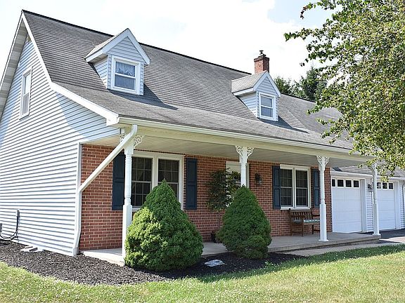Cape home with over sized two car garage. Large kitchen was recently remodeled with an island added. Large dinning room adjacent to kitchen. Living room and guest bedroom also on the first floor. Partial finished basement with man cave/den. Outside stairwell basement access with Bilco door. Upstairs you will find two bedrooms and a bath. Also upstairs the master suite has bath with heated tile floor and two large closets one being a walk in. Two additional closets on the 2nd floor hall way. The oversize(28'x28') two car garage is finished and insulated. Behind the house is a large paver patio and a 12'x16' vinyl gazebo. In the big back yard is a storage building/garage measuring 14'x32' with a full length storage loft. The house is cooled and heated by two heat pump systems, one per floor. Additionally an oil fired heating stove is in the basement as an alternate heat source. Major appliances are included. Home Warranty included! Furnishings in master suite included. All other furniture can be considered with offer. Seller will consider offers from and will work with your realtor.