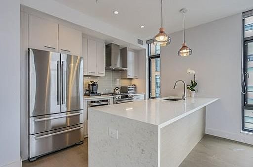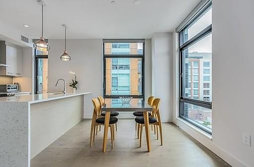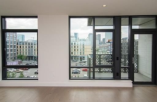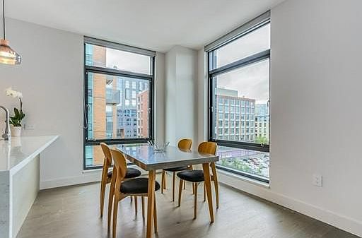 Dramatic corner 2 bedroom/2 bath at Siena features wide open living/dining/kitchen with wall of windows and private balcony. Entry hall leads to spacious entertainment space with hardwood floors and great city views. Gleaming stainless steel kitchen with stone counters and convenient breakfast bar. Split bedroom layout offers privacy and includes master with huge en suite bath and walk-in closet. Includes one garage parking space. Siena offers stylish clubroom, huge furnished roof deck and lovely common areas throughout.