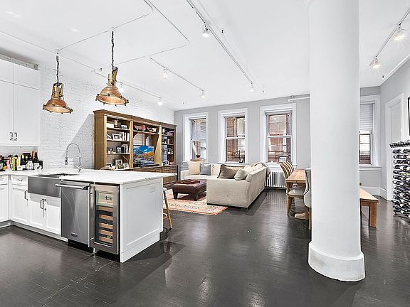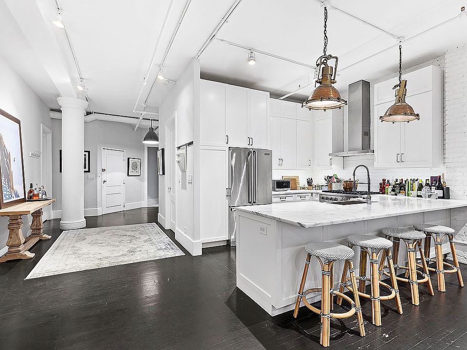 Residence 3E is a 1,600sf true 1905 New York City loft with wide-open spaces that have been configured into a large master bedroom and a similarly-sized den/2nd bedroom along with a home office. The open-concept kitchen invites guests to a marble countertop under industrial lights and a stainless-steel apron sink to continue the 1900’s vernacular. There are modern Viking appliances including a gas stove, refrigerator, wine fridge and dishwasher. Two full bathrooms have been lovingly renovated with a nod to the old-world style and the conveniences of modern design. The focus of the master bath is a cast iron claw bathtub resting on penny tiles with countertops of Carrera marble and double sinks with Waterworks fixtures. High ceilings, hardwood floors, a gracious foyer with a giant walk-in entry closet and a washer and dryer in the residence complete the design.