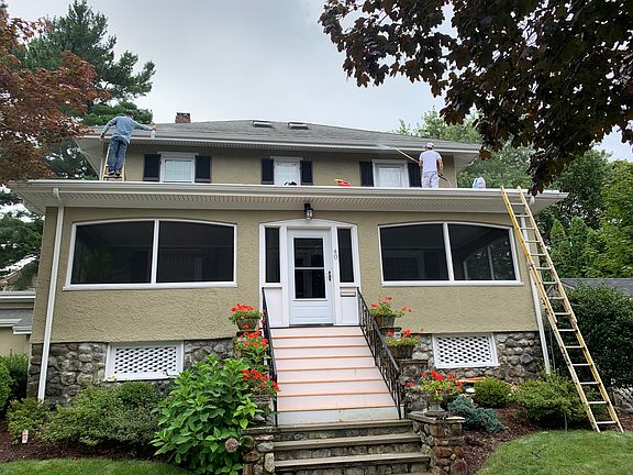 Central entrance colonial stucco with screen front porch / 3 season front porch . We also have a loft on the 3rd floor that can be used as an office , or bed room .