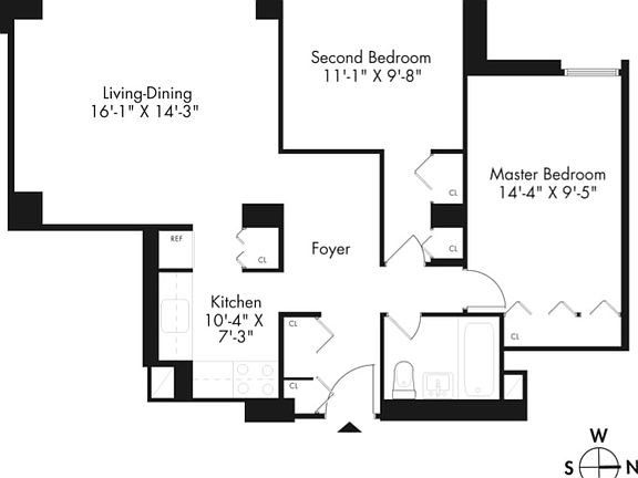 Low floor two bedroom, one bath apartment with lots of closet space, limited kitchen renovation, and west/south views of the city. 867 sq ft.Two-acred landscaped plaza w/ river and city views, year-round activities schedule, playgrounds, on-site preschool, free Wi-Fi, sundeck, restaurant/lounge on site, groceries, banking, dry cleaning, shopping on-site