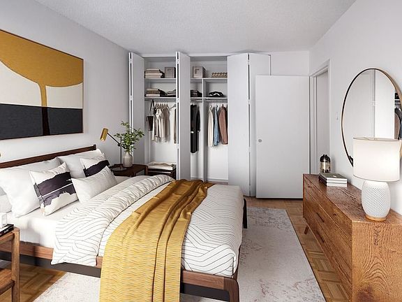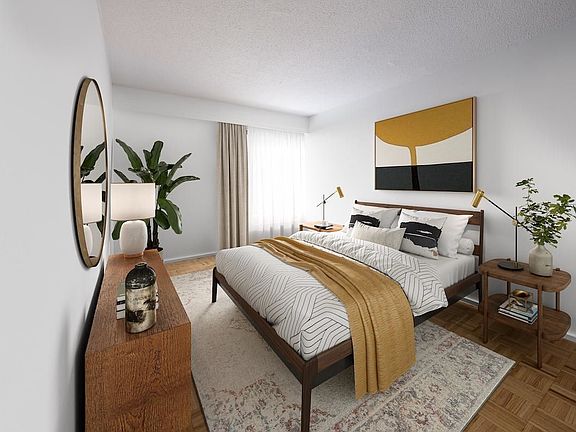 Mid floor two bedroom, one bath apartment with newly remodeled kitchen, lots of closet space, and west views of the city. 812 sq ft.Two-acred landscaped plaza w/ river and city views, year-round activities schedule, playgrounds, on-site preschool, free Wi-Fi, sundeck, restaurant/lounge on site, groceries, banking, dry cleaning, shopping on-site