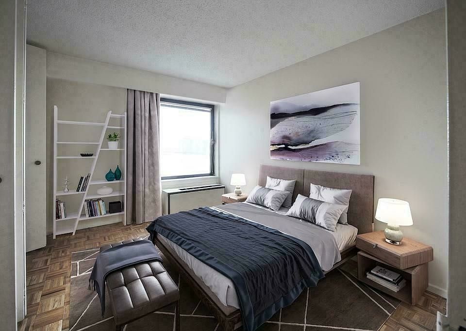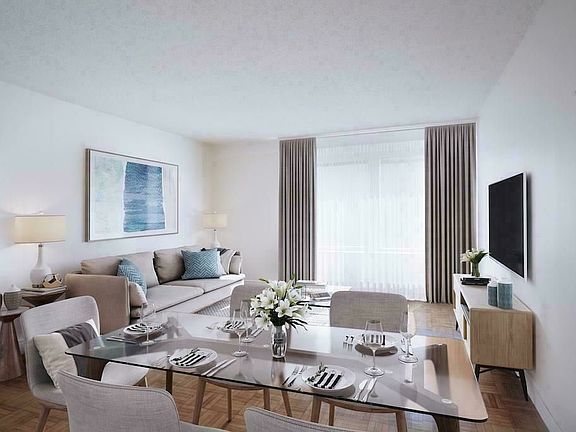 One bedroom, one bath apartment with ample closet space, classic kitchen, and mid floor south views to the city. 589 sq ft. Available now.The rent shown is the Net Effective Rent, with 3 (or 2) months free on a 12 month lease, given at the beginning of Lease. Tenant will pay the Gross Rent for the remaining months.Two-acred landscaped plaza w/ river and city views, year-round activities schedule, playgrounds, on-site preschool, free Wi-Fi, sundeck, restaurant/lounge on site, groceries, banking, dry cleaning, shopping on-site