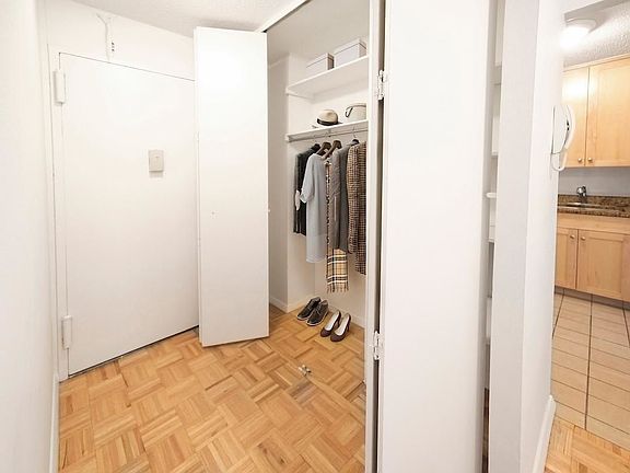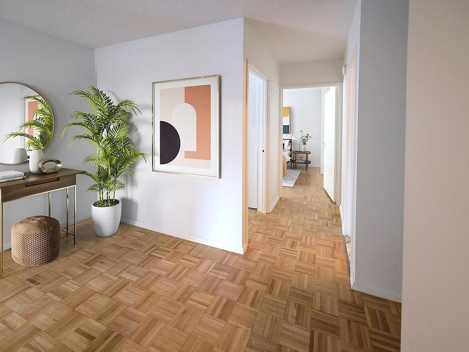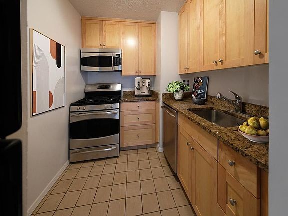High floor two bedroom, one bath apartment with lots of closet space, newly refinished granite and stainless steel kitchen, and south/west views of the city. 812 sq ft.Two-acred landscaped plaza w/ river and city views, year-round activities schedule, playgrounds, on-site preschool, free Wi-Fi, sundeck, restaurant/lounge on site, groceries, banking, dry cleaning, shopping on-site