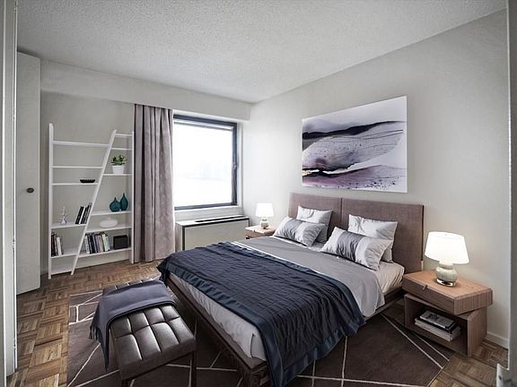 Low floor two bedroom, one bath apartment with new granite and stainless steel kitchen, lots of storage space with walk in closet, and west/south views of the city. 867 sq ft.Two-acred landscaped plaza w/ river and city views, year-round activities schedule, playgrounds, on-site preschool, free Wi-Fi, sundeck, restaurant/lounge on site, groceries, banking, dry cleaning, shopping on-site