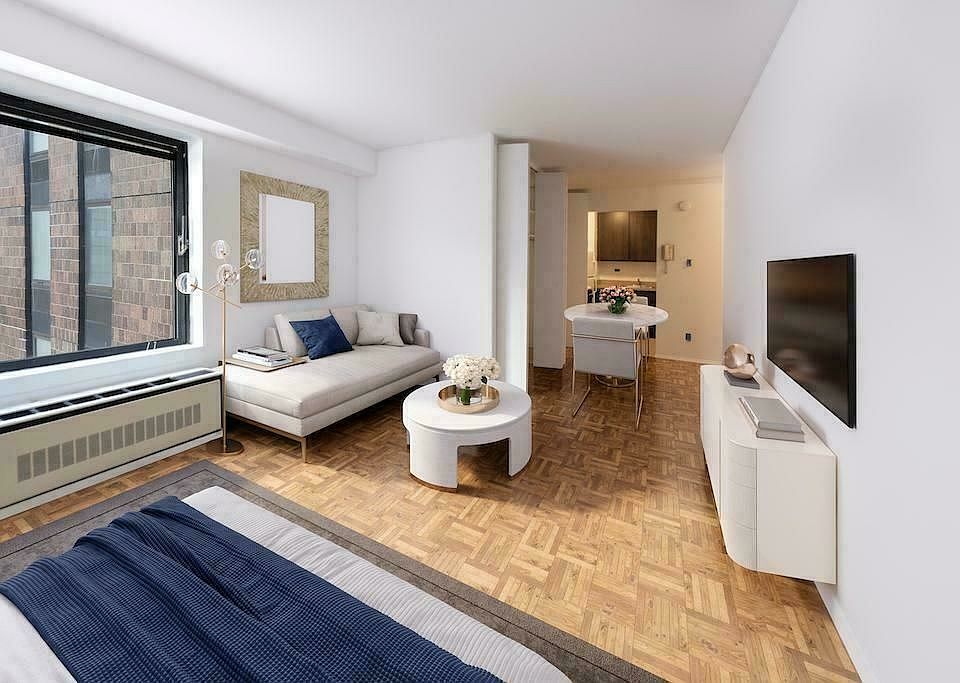 Studio apartment with lots of closet space, private dressing area, classic kitchen, and high floor west views to the city. 424 sq ft. Available 6/7.The rent shown is the Net Effective Rent, with 3 (or 2) months free on a 12 month lease, given at the beginning of Lease. Tenant will pay the Gross Rent for the remaining months.Two-acred landscaped plaza w/ river and city views, year-round activities schedule, playgrounds, on-site preschool, free Wi-Fi, sundeck, restaurant/lounge on site, groceries, banking, dry cleaning, shopping on-site