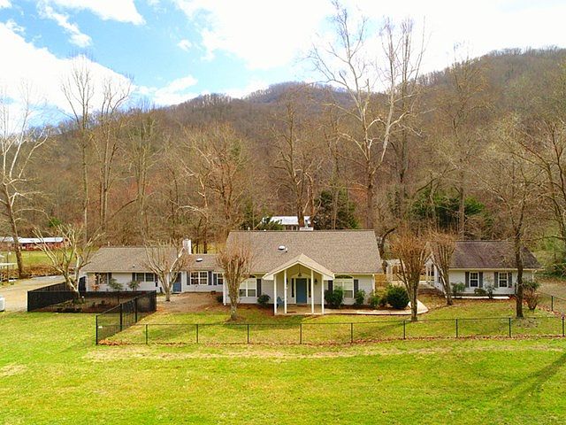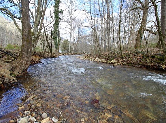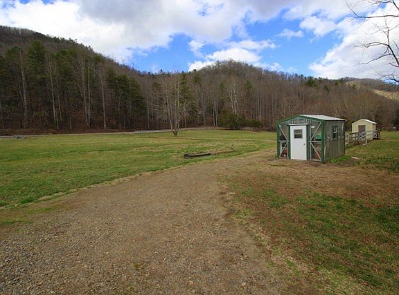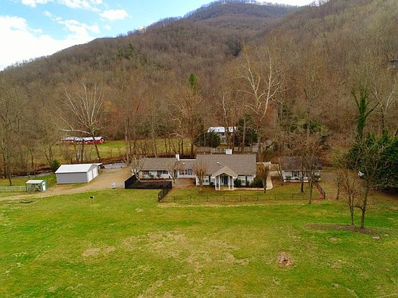 WOW! What an amazing setting! Over 500' of bold Wayah creek frontage and situated on over 3 acres of flat usable pasture land! Rare find!!This home has a unique setup which includes two living spaces ( attached) that would make a great in law suite. This suite offers 1 bedroom and 2 baths with a kitchen with quartz counter tops. A place for a freestanding wood stove, hardwood floors, vaulted ceiling. There is also a sunroom just feet from noisy creek. Perfect relaxation spot! Very cozy and inviting! The other end of the home offers another full kitchen, and open living room with wood burning fireplace and vaulted ceiling. There are two bedrooms(1 with no closet- 2 bedroom septic) and 1 bath. The outside living space is just as great as the inside! Sit on the patio and relax and enjoy the rushing creek just a few feet away! There are two detached 2 car garages great for car storage, a workshop, or any of your favorite hobbies. Fenced area for the pets. Plenty of space for a garden! Bring the animals! This is one amazing setting!