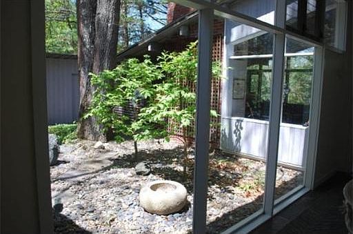 Rare offering. Chic, Architect designed contemporary home built in 1954 with later additions. Dramatic floor to ceiling glass walls in the living and dining room with views of private wooded grounds. Fireplace with marble surround and hard wood floors. Bright efficient kitchen with views of the Japanese stone garden.Master with full bath, generous closet space, exterior balcony and glass walls. Second bedroom with full bath. Beautiful 1st floor family room with entire wall of glass. Lower level offers over sized play room, an office and another full bath plus the laundry and utility room. 2 car garage, Private secluded 1+ acre grounds yet minutes to schools, Legacy Place and public transportation. All showing start at Open house 12 to 2 Sunday 5/18/2014