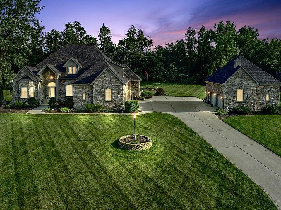 Welcome Home to this exquisite property beautifully nestled on 1.74 acres in sought after Moraine Manor. Offering a seamless blend of luxury and functionality, this residence has been meticulously maintained and is designed to impress the most discerning buyers. Key Features:Interior: Step inside to discover over 6700 sq ft with an open-concept layout adorned w/ high-end finishes and designer touches throughout. The spacious living area showcases a stunning fireplace, tall ceilings & beautiful French doors leading to your backyard oasis. An elegant dining room is ideal for entertaining. The main floor also showcases an extra den & library.Kitchen: A chef's dream kitchen awaits with newer appliances, custom cabinetry, & ample counter space for culinary creations. Perfect for entertaining or casual dining with family.Bedrooms: Retreat to the main floor primary suite featuring a luxurious ensuite bathroom & huge, must see walk-in closet. Upstairs, 3 more guest rooms all feature large WICs & their own private baths. A large flex room upstairs is ideal for an extra hangout space.Walk-out basement w/ related living: Enter another complete living area in this wonderfully finished basement featuring a full kitchen, large recreation/family room, two bedrooms, workshop, full bath& another half bath for guests! Also plumbed for future washer/dryer if desired.Outdoor Oasis: Escape to your private backyard sanctuary on 1.74 acres backing up to a wooded tree line - complete w/ gorgeous landscaping, patio area, & space for outdoor dining & relaxation. Garage/Storage: There is no shortage of storage with an additional 3 car detached garage! Featuring 100 amp service, cable, & water available.Additional Features: Entire home is stone, totaling 14,000 square feet! 2x6 construction, full yard irrigation, 4 year old roof/gutters, 2 furnaces, 2 AC's.Ideal north Valparaiso locale, Duneland Schools, close to HGWYs for commuters.