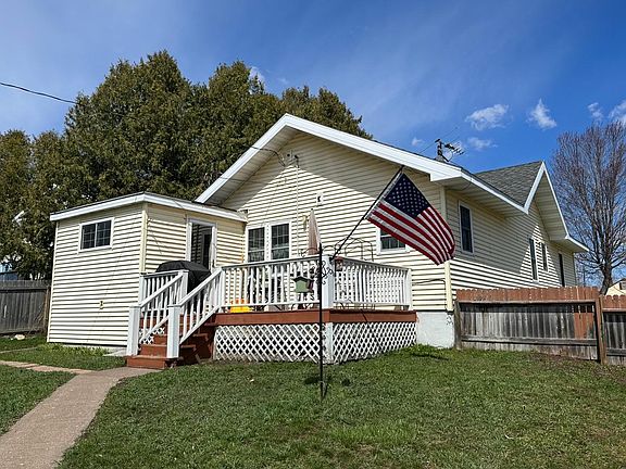 Move in ready great 2 Bdrm house with all living facilities and laundry on the MAIN LEVEL! Fenced in backyard! You'll have nice size kitchen, dining room, good size living room, bedroom w/walk in closet, another Bd, specious laundry room, full Ba, 3 season porch/mud room. Lots of big money updates were done about 10 years ago including: roof shingles, vinyl siding, windows. Water heater new in 2022. House is on a partial basement with all kinds of extra storage, utility area, partially finished room (no egress) that could be used as an office/den, 1/2 bath with a room for a shower. Good size back deck. Oversized 1 car det. garage and shed. You'll be only 2 blocks away from the lake and Moose Lake park. Walking distance to the grocery store, bank and other amenities that Moose Lake has to offer. Schedule your showing today! This property will not last long.