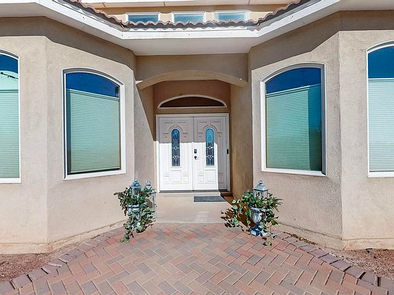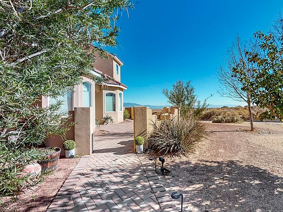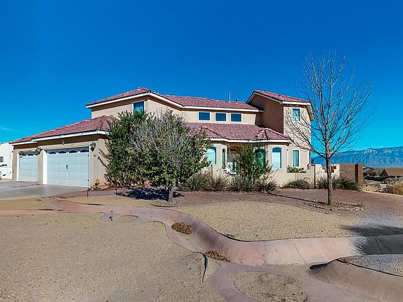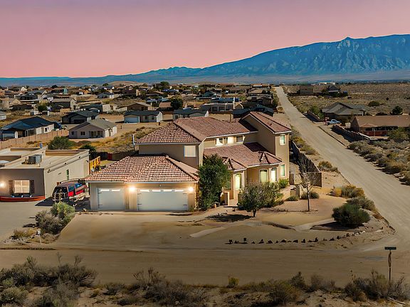 Enjoy breathtaking mountain views from this custom home on a large 1/2 acre lot. Delight in the Chef's Kitchen with granite countertops, beautiful brick tile backsplash, & custom cabinetry with stainless steel appliances. The lovely kitchen opens into your beautiful living space with a gas fireplace and French doors that open onto your expansive wrap-around covered patio overlooking the Sandias. Create your backyard oasis with plenty of space for everything imaginable. Cozy dining room & separate kitchen nook are great for entertaining. Upstairs you'll find an amazing Loft/Game Room with more Stunning views!! The Primary Bedroom plus two additional bedrooms upstairs complete this home! 2 Sheds, NEW backyard block wall & Refrigerated Air!! (All Grass is Virtual) Build Green NM Silver.
