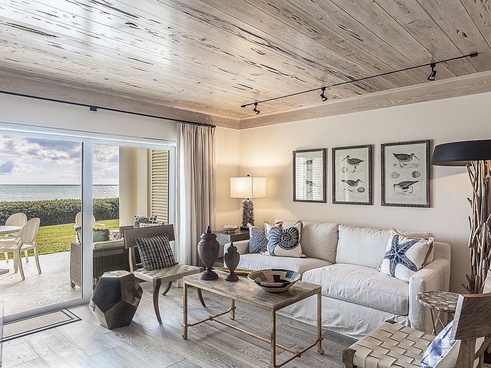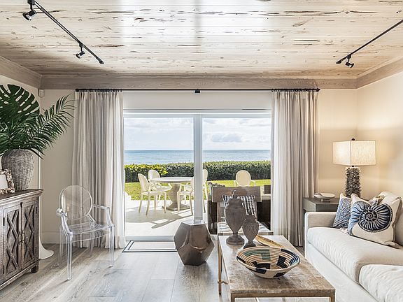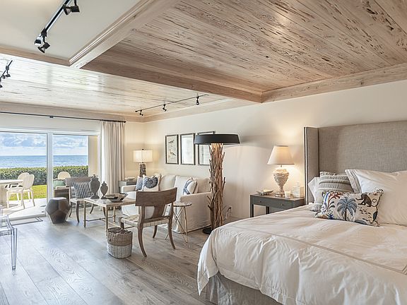 Enjoy showstopping details and gentle beach breezes in this luxurious 1BR/1BA suite with large private patio and bonus bunkroom. Meticulously and thoughtfully designed to take advantage of every inch of space, the residence is centered with one of the widest direct ocean views in the building and affords a new level of living in the Island House. Revel in distinct and elegant appointments such as intricate pecky cypress ceilings in the bedroom/main living area, custom finishes and warm wood flooring. A kitchenette with marble countertop provides ample storage and boasts top-tier appliances, including a Wolf induction cooktop, Miele dishwasher, built-in refrigerator and microwave. This standard-setting suite also features custom lighting, wiring for alarm system installation, and a custom-crafted bunkroom with additional storage - convenient, comfortable and innovative. Completing this picture, the beautifully enhanced bathroom hosts a spacious walk-in shower and hidden laundry closet with stackable washer/dryer. With the private beach access mere steps from your covered patio, a lushly landscaped courtyard pool and the Beach Club a quick stroll away, indulge in effortless oceanfront living tailored with tasteful design.