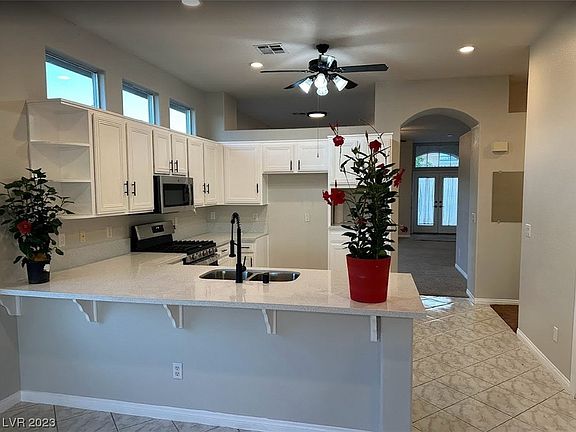 This beautiful one-story house in the Chardonnay community of Summerlin North is ready to move in! It's perfectly located in the northern part of Summerlin, close to the Red Rock Casino, Summerlin Centre, and Downtown Summerlin. Sitting on a corner lot, you'll appreciate the lovely desert landscaping in the front yard and a covered patio in the backyard, perfect for your BBQ parties, along with two fruit trees. The kitchen has been recently remodeled with new quartz countertops, modern appliances, and a brand-new water heater. The primary bedroom is spacious and features a walk-in closet, a separate shower, a relaxing jetted bathtub, and dual sinks. The other bedrooms have ceiling fans and ample closet space. Owner is listing agent.