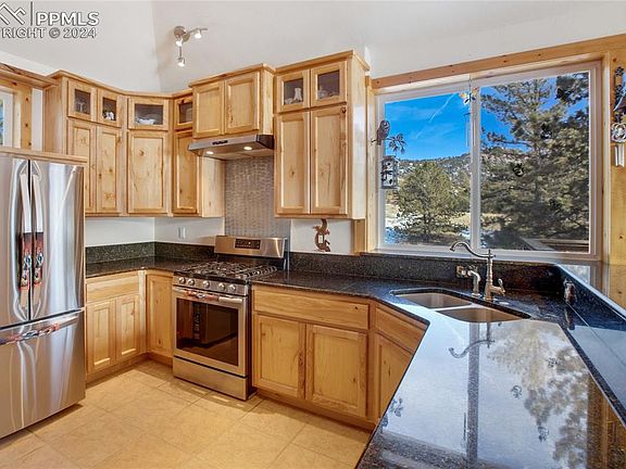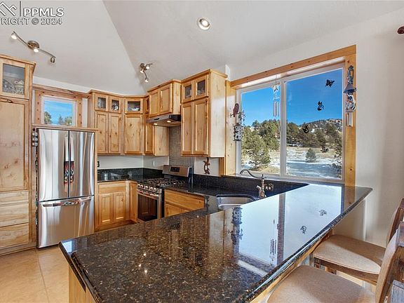 Imagine enjoying complete peace and privacy, surrounded by nature. This cozy home is nestled in the beautiful rocky mountains, with easy travel to Cripple Creek, Woodland Park, and the Springs. Evergreen Station is just down the road - a quick stop for gas and milk. You can enjoy a good cup of coffee next to your Jotul wood burning stove. Backing up to a conservation area, will maintain your privacy on one of your decks or walk out patio, with views of mountains, Dome Rock, Four Mile Creek, pastures, and wildlife. Your feet will always be warm with in-floor heating. The kitchen boasts new, stainless appliances, granite countertops, hickory cabinets, pull out shelves, and soft closing drawers. The bathrooms are spacious, with walk in showers and granite countertops. The oversized garage has a wood burning stove and is a shop lover’s dream. The property features a small, finished, dry cabin to use, perhaps, for crafts, a kids’ bunkhouse, man/woman cave, or whatever you wish. You will love not having a water or electric bill! When others are out of power, you will never have to worry, as this property runs itself with, maintenance-free, solar power, cutting edge batteries, and an automatic backup Generac Ecogen generator. The solar is a 3kw system with 3 - 48v Discover LiFePo maintenance free batteries rated for 10000 cycles. And an Outback inverter. For those working from home, Starlink Satellite internet means you always have great internet connectivity. If you have pets, they will be safe in their fully fenced yards, all 2+ acres, and a dog/cat run. This home is move in ready, and you will be pleasantly surprised with the many extras included! This house and property are a gem and will provide peace of mind and amazing mountain living - schedule a showing today!