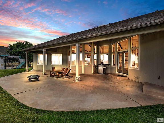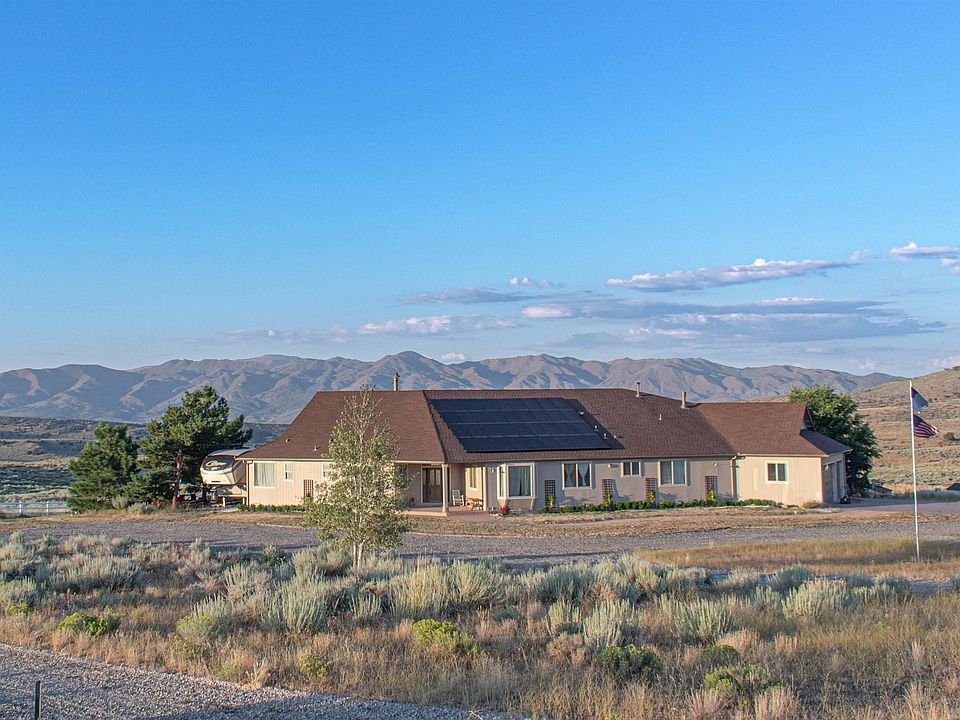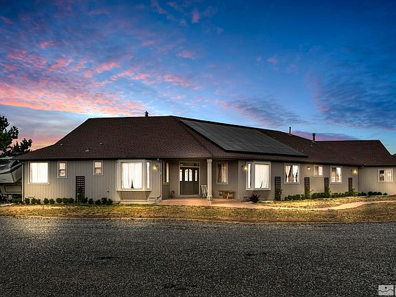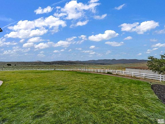 Welcome to serenity and gorgeous long-distance views in this custom built, single-level home with direct access to over 72,000 acres of BLM land. Ride a horse or ATV right off the property to go explore. The sellers’ 3% loan rate with no PMI costs may be assumable for qualified buyers and will save money on your mortgage. The assumable loan is negotiable. Only 20 minutes from highway 395 and 30 minutes from UNR., This unique home's 16 ft. cathedral ceilings and extremely open floor plan is perfect for entertaining. With large windows throughout, natural light fills the home. The great room includes kitchen, dining room and living room with direct access to a large, covered patio with endless views. The kitchen features picture windows, stainless steel appliances, a five-burner gas stove, built in microwave and pantry. In its own wing, the large master bedroom and bathroom with double sinks and jetted tub create a sanctuary for relaxing. A double-sided fireplace in the master bedroom and living room adds ambiance and warmth. All carpet is 100% wool. In addition to three bedrooms, the family room is a great space for media, crafting, or playroom or could be converted to a 4th bedroom. The three-car garage is 30'x30' with 10 ft. ceilings and a roughed-in addition above that could be a 4th bedroom, man cave, or office. The property is fully fenced and gated and features a recently built 11kw, owned solar system with high efficiency Solar World panels, integrated emergency power supply, and EV charging. The electric appliances, offset by the solar system, as well as the pellet stove and fireplace keep propane and electric costs low. Enjoy quiet privacy at the end of a cul-de-sac with no HOA or CC&Rs and a location that adjoins expansive BLM with roaming wildlife. All tile will be completed before closing.